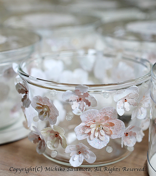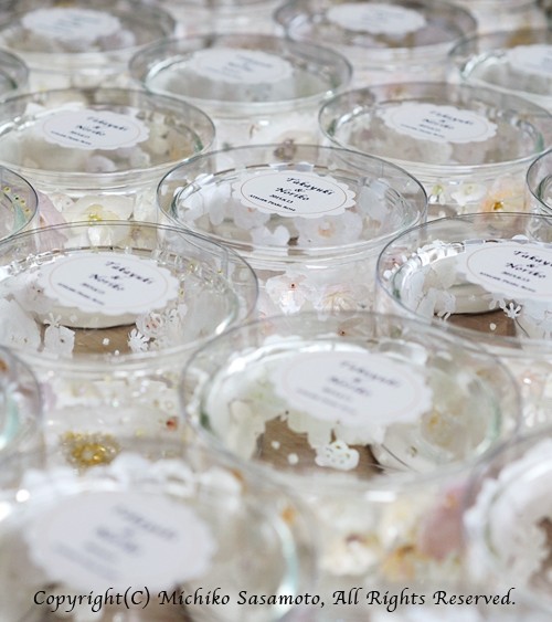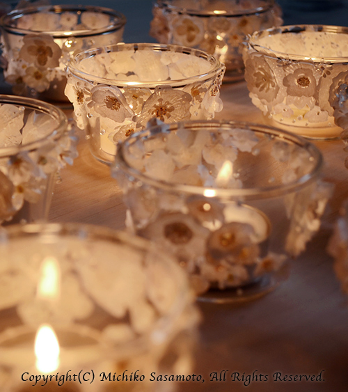 宴では、本作に入れたティーライトを灯し、終わりには、ゲストに自由に選びお持ち帰り頂きました。