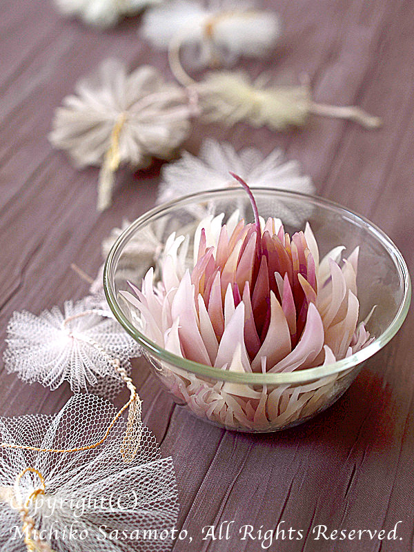 婚礼のブーケやコサージュで親しまれるセルリアをモチーフにして、グラスに繊細かつ可憐な花を咲かせます。花びらに動きを加え、本物以上の生命感を目指し、1点をじっくり作成します。